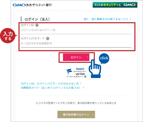 インターネットバンキングにログイン後の振込みのお取引や、お客さま情報変更のお手続きなどに使用するものです。 - 前の手順で「ログイン」ボタンをクリック後に、口座開設申込時に登録したメールアドレス宛てに送付される認証コードを入力してください。