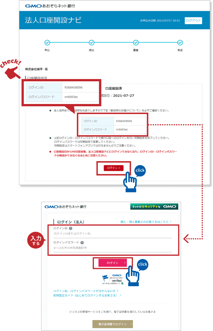 法人口座開設ナビへのログイン期間は「口座開設手続きに関するお知らせ」メールの配信日翌日から90日間です。