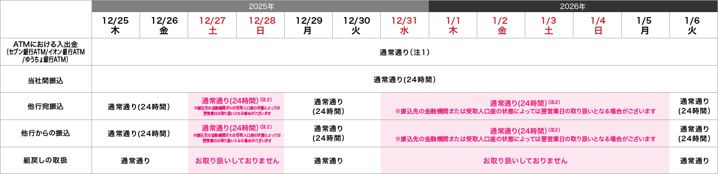 • ※ (注2)12月31日~1月4日の各日23:50~翌4:00の間は振込先口座確認サービスをご利用いただけません。