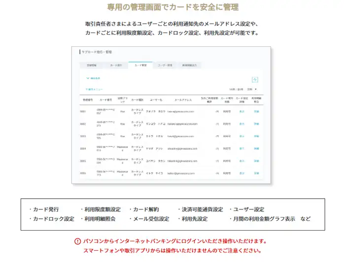 出張や購買など、実際にカードが必要な社員や部署に限定して発行すれば、リスクを抑えながら経費処理を効率化できます。さらに、定期的に発行状況を見直し、不要になったカードを回収・停止することで、安全でシンプルな運用が可能になります。