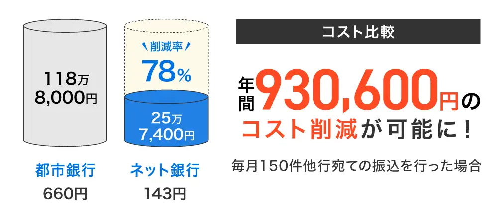 1件当たりの差は一見小さく見えますが、月間100件の振込を行う企業の場合、ネット銀行を活用すると、年間で約12万円~62万円のコスト削減効果があります。さらに、振込件数が多い企業向けに優遇プランを用意しているネット銀行もあるので、うまく利用すれば、さらなる削減も可能です。