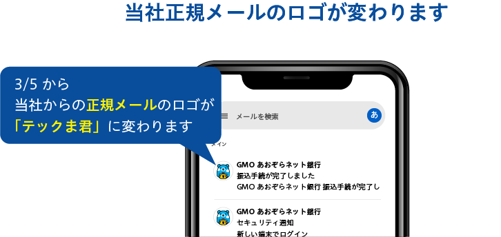 現在、当社正規メールには、差出人欄に「GMO」3文字のロゴが表示されておりますが、2026年3月5日(木)より、ロゴ表示を当社公式キャラクターの「テックま君」へ変更いたします。公式キャラクターの表示により、当社からの正規メールであることをより直感的にご認識いただけるようになります。
