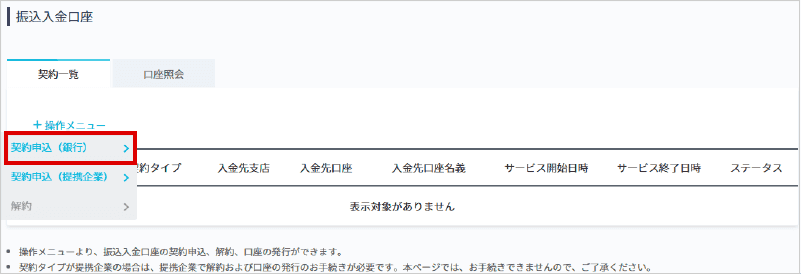 「操作メニュー」から「契約申込(銀行)」を選択し、
