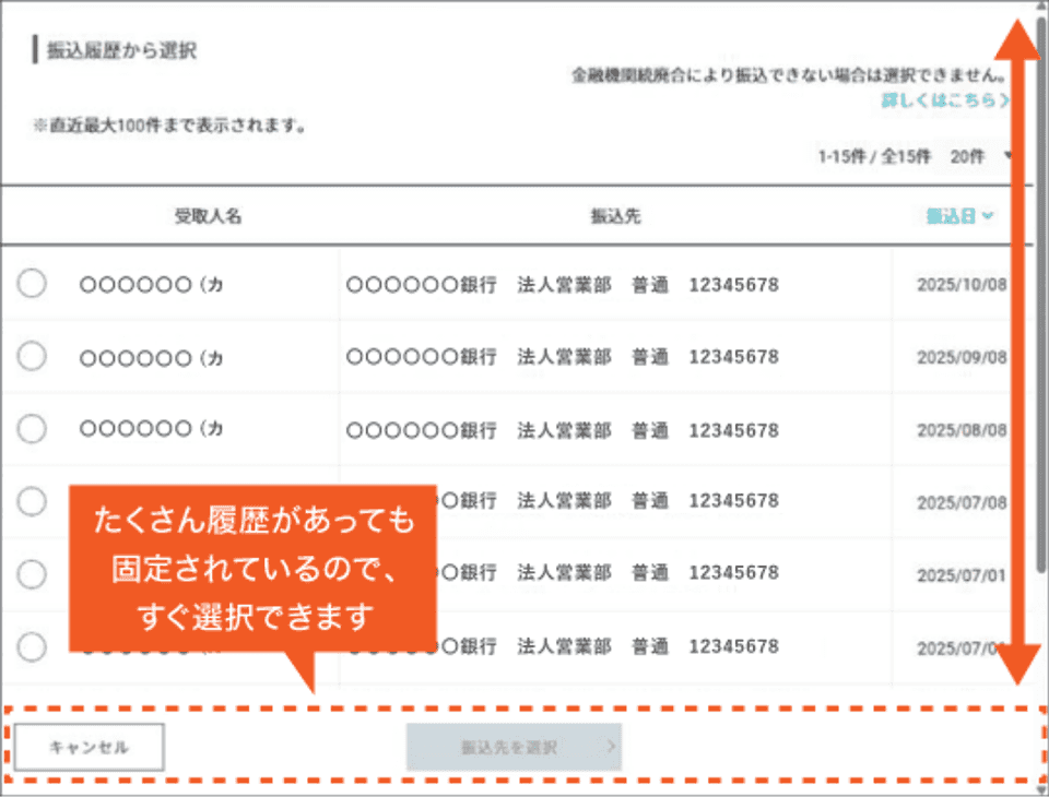 2025年11月 振込履歴から振込先を選択する際、選択ボタンまでが遠く不便だ。