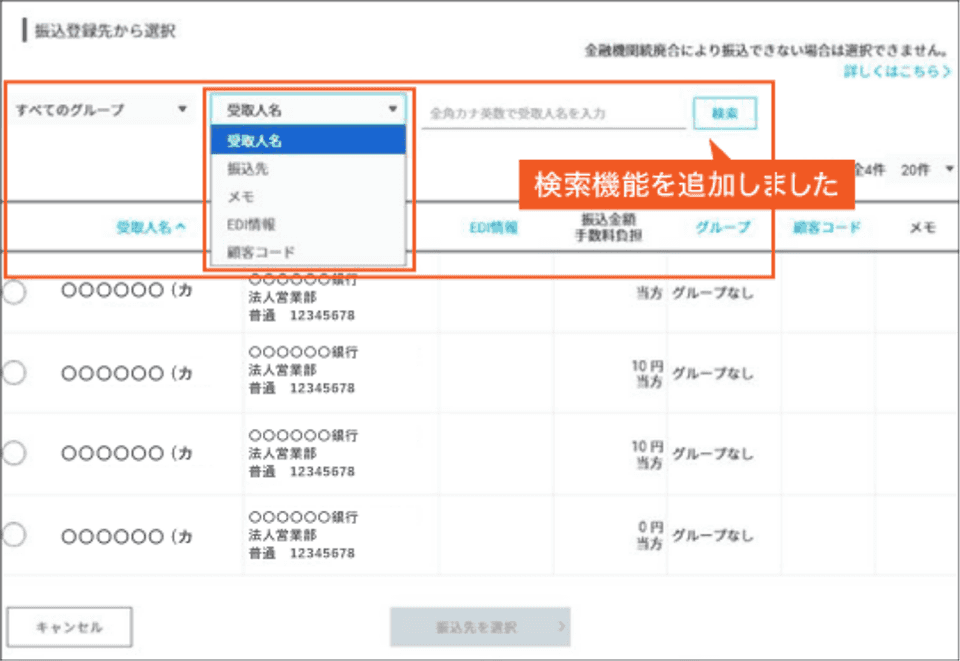 2025年8月の定期メンテナンスにて対応いたしました。 振込登録先を選択する際に、「受取人名」「振込先」「メモ」「EDI情報」「顧客コード」で検索可能になりました。