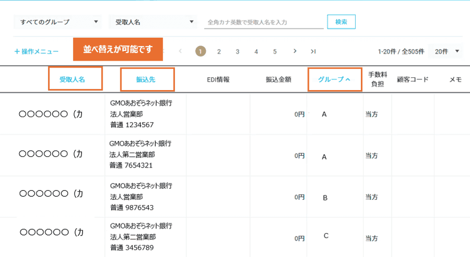 また、「受取人名」「振込先」「グループ」について、並べ替えすることも可能になりました。